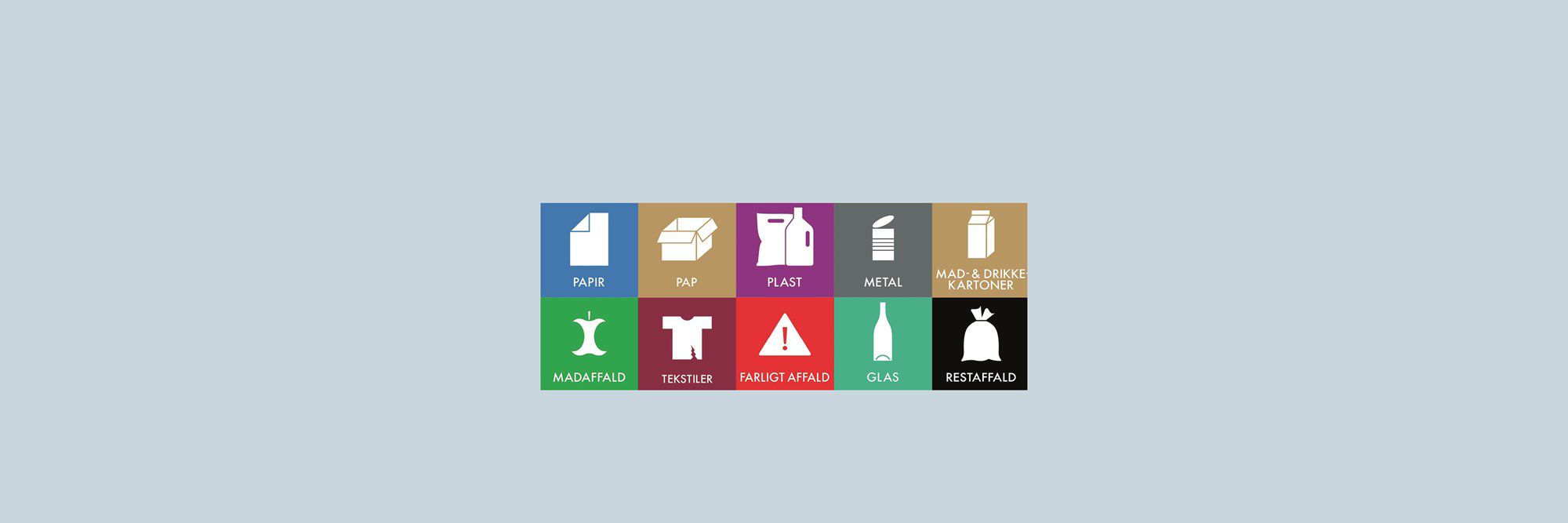 Vi skal alle sammen sortere vores affald i de samme affaldstyper derhjemme, på arbejde og i fritiden. De ti landdækkende affaldstyper er: Papir, pap, plast, metal, mad- og drikkekartoner, glas, madaffald, tekstilaffald, farligt affald og restaffald (se billedet øverst på siden).