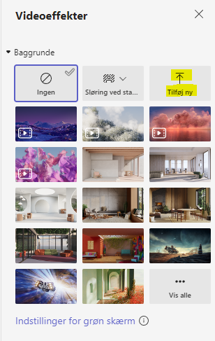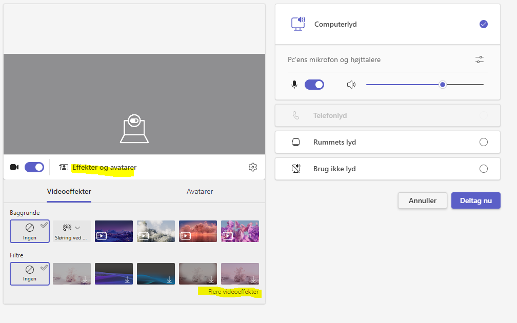 Inden du starter/deltager i mødet, tryk på Effekter og avatarer og vælg Flere videoeffekter: