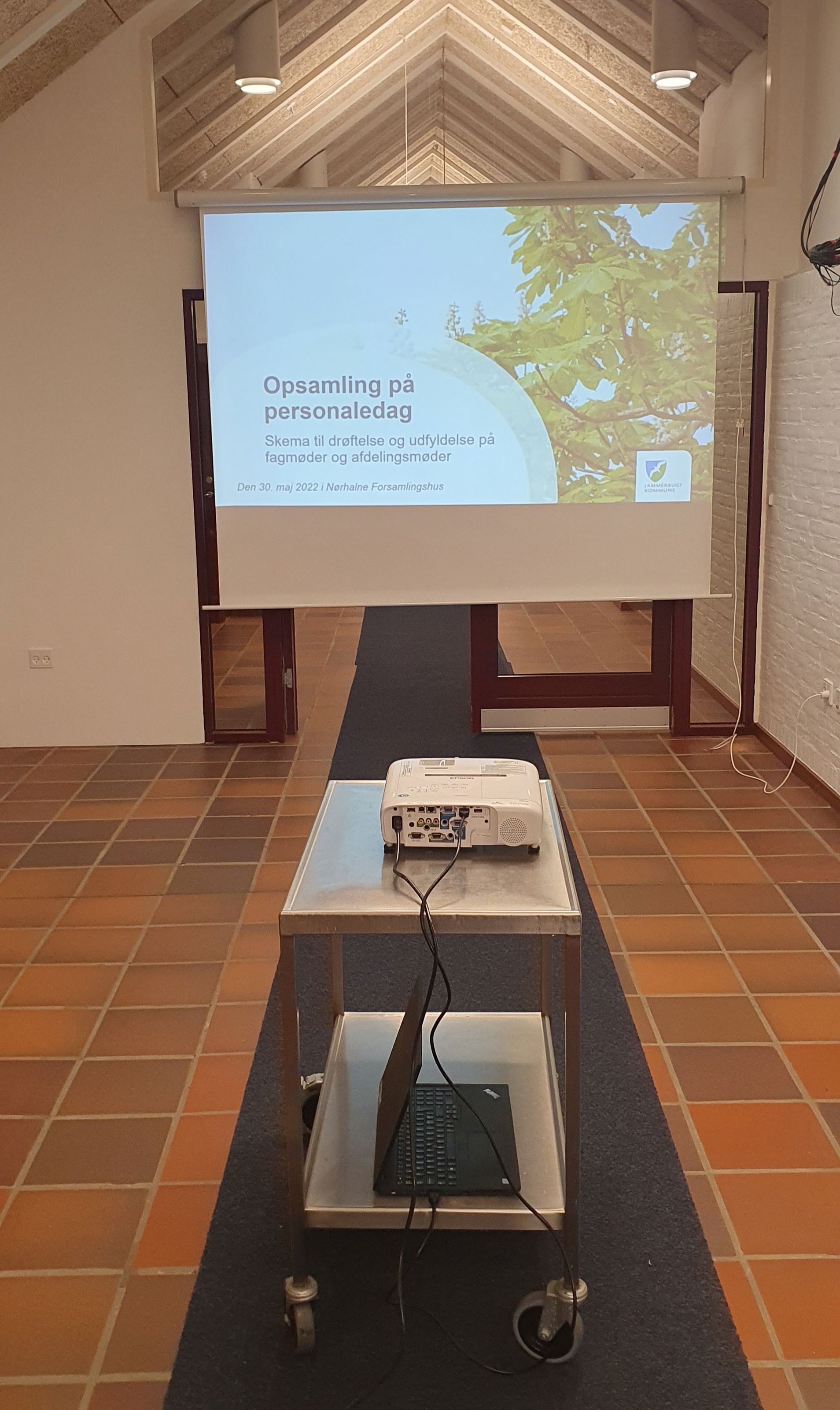 Der er nu blevet opsat et lærred i mellemgangen, så det er muligt at vise præsentationer for lidt større forsamlinger. Projektor kan bookes som vanligt via kalenderen i Outlook.
